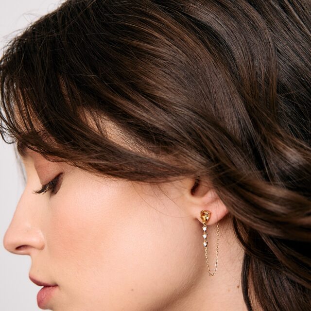 Brinco Solitário Gota Citrino Com Corrente – Dourado